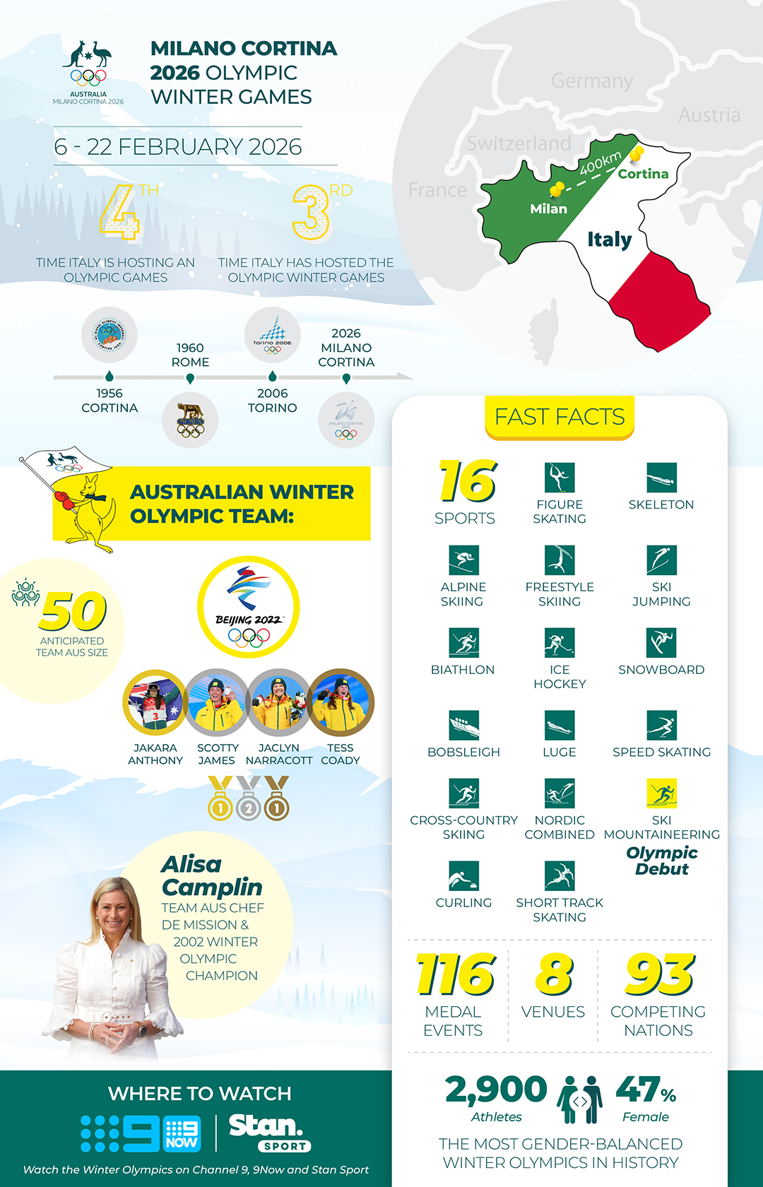 The Milano Cortina 2026 Winter Olympics will be broadcast exclusively in Australia on Channel 9 and 9Now.