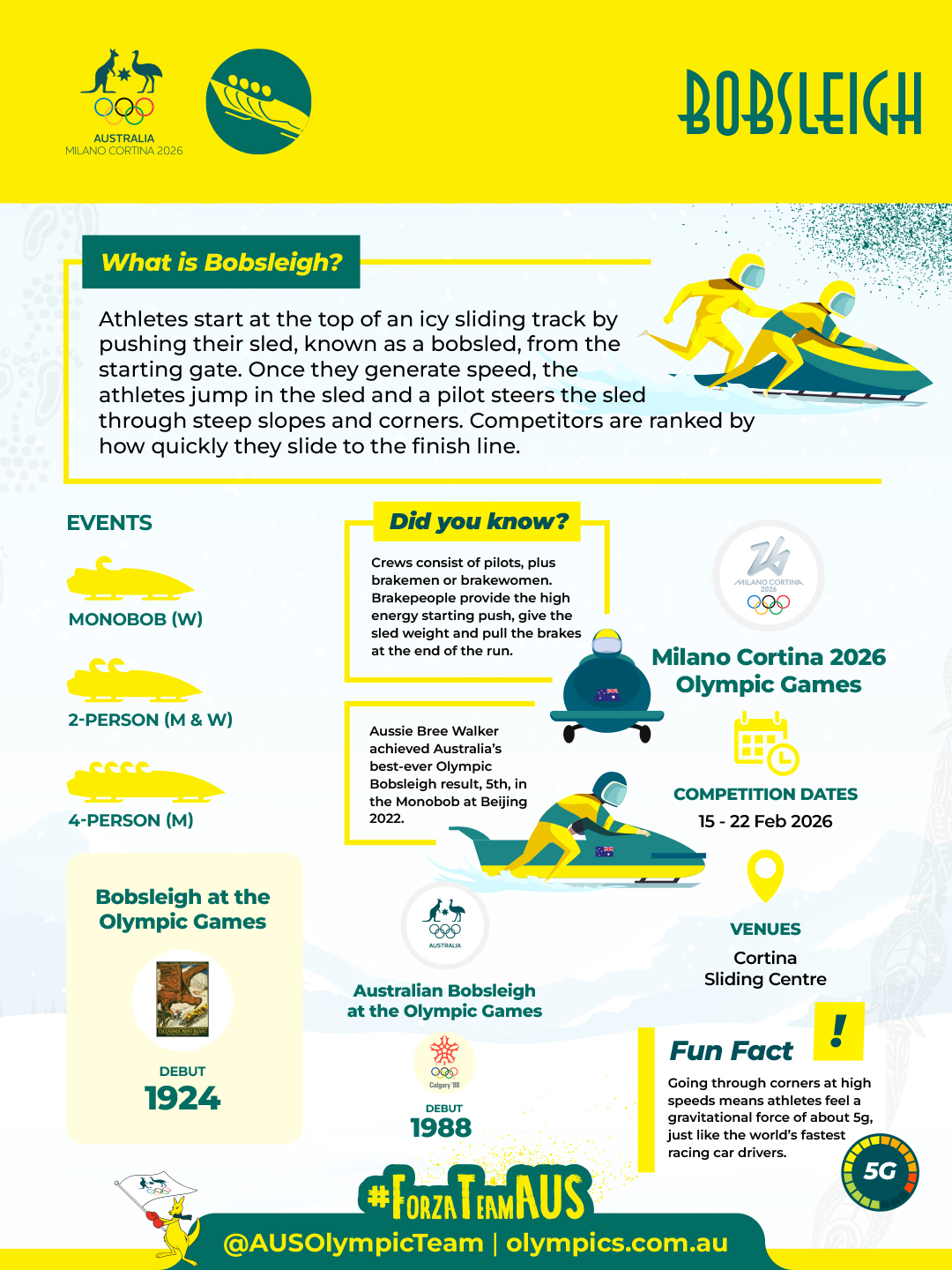 Beijing 2022 was a monumental Olympics for Australian bobsleigh. The Olympic debut of monobob, a solo women's event, saw Bree Walker challenge for an Olympic medal and claimed Australia's best-ever Olympic result in the sport, 5th. She also teamed up with Kiara Reddingius to place 16th in the two-woman event.